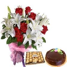 See you soonSend beautiful lilies,red roses and mixed flowers in a bouquet .it contains Pink Lilies and mixed flowers and greens. A free Card is attached.24 pcs Ferrero and cake included. |