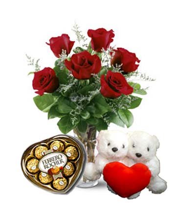 1'll be there for you6 Red Roses with Couple Bear Heart , pilow and Ferrero Chocolates. Perfect for your Valentine's Gift |