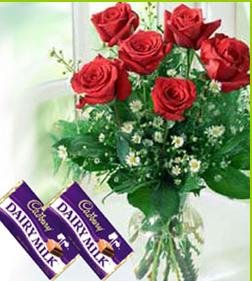 Haft dozen red roses in a vase w/ 2x75 grams. A nice gift when you fall in love with someone but don't know what to offer her.Your gift will come with a greeting card and your message