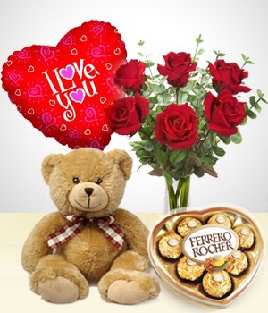 We have the perfect gift for Valentines..... Includes: - 6 rose in a vase - A teddy bear 24 inchses - I love you balloon - A chocolate heart shaped box