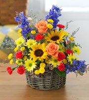 Flowers basket-2Beautifully arranged sunflowers,seasonal flower,red roses in a basket - long lasting beauty! |
