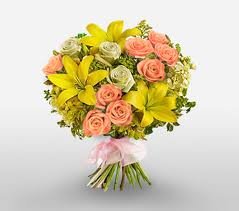 Simply classsicA beautiful contemporary, star studded collection of pink and cream spray roses, yellow lilies with seasonal flowers and greens in a bouquet tied with a light pink ribbon is sure to brighten up anyone's day. |