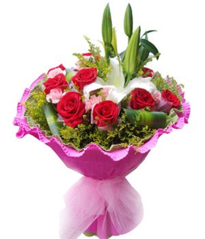 A Great Love9 red roses, 9 pink carnations and 2 perfumes lilies with solidago, green stuff decorated. Pink gauze and bowknot tied hand bouquet. |