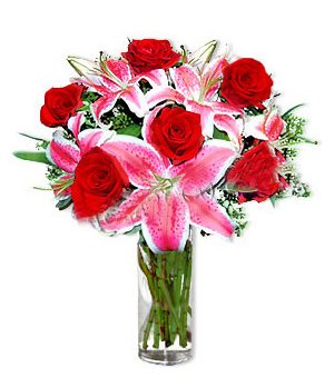 Angel Kiss9 premium red roses and 3 pink perfume lilies, small flowers and green leaf or decorated, arranged in a beautiful vase. |