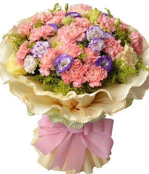 Flowers For Mom19 selected pink carnations, solidago canadensis and eustoma(or similar flora), light yellow edge curl paper round packing. |