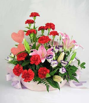 12 red carnations, 1 stalks pink perfume lily, match balloonflowers, match green leaves, 2 pink paper hearts, flowers basket. (The picture is only for reference and the main items are the same, the effect is guaranteed.)