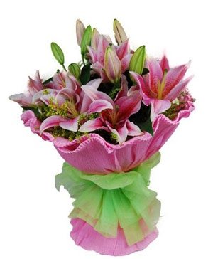 Lovesickness6 pink perfume lilies with solidago canadensis ornament. Pink color edge curl paper round package. Sour, sweet but lovesickness is a kind of happiness. |