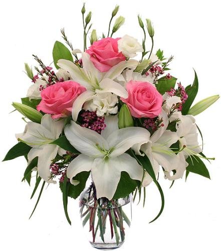 LOVING BOUQUETNothing tells your loved ones how much you love them than this gorgeous sophisticated flower bouquet. Pink roses and white lilies are delicately hand arranged with other flowers of the finest quality. |