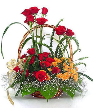 24 red roses and 6 yellew carnation(or champagne roses) with gypsophila and green leaves, beautiful flowers basket arrangements. - Order two days ahead.