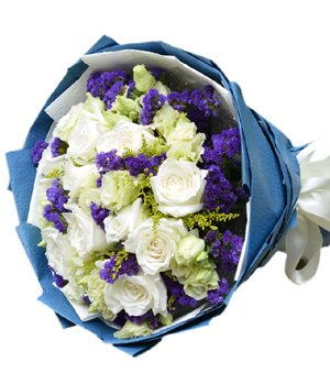 Secret Obsession11 premium white rose bouquet, forget-me-not and grandiflorum decorated. Wraps with white and blue crepe paper, ties white bowknot. |