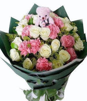 11 white roses, 12 pink carnations, green leaves, a small teddy bear sit on bouquet, available for Great love, as wells as for mother annd elder women