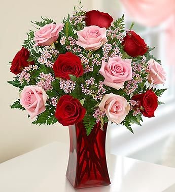 6 pink and 6 red roses in a vase. vase may vary