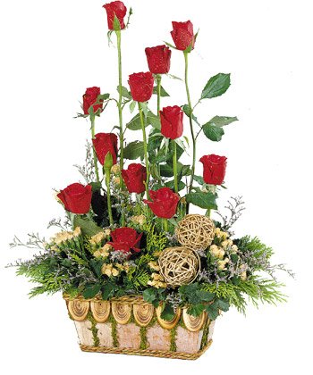 Beautifully arranged flowers in an old fashioned basket - long lasting beauty! 24 red roses in a basket.